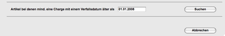 Diese Suche liefert eine Liste von Artikeln bei denen eine Charge das angegebene Haltbarkeitsdatum überschritten hat.