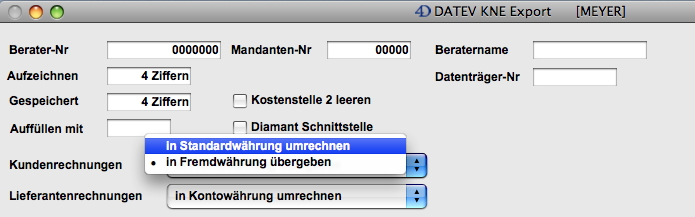 Im Dialog für den KNE Export kann nun, für Kunden- und Lieferantenrechnungen in Fremdwährungen, die Aufzeichnungsart gewählt werden. Rechnungen in der Basiswährung (z.B. EUR) sind von dieser Einstellung nicht betroffen. Für die Buchungen ist die Angabe "Kurs" in den Fremdwährungseinstellungen relvant. Der Planwert wird z.B. für die Umrechnungen des Auftragswerts benutzt.