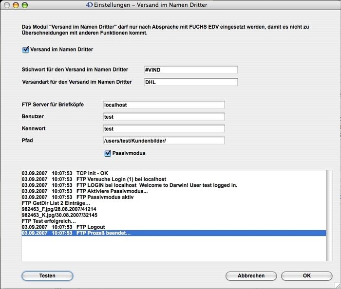 - Die Bilder für Kopf und Fußteil der Lieferscheine werden in einem zentralen FTP Verzeichnis abgelegt. Sie können den Zugriff mit der Schaltfläche Testen ausprobieren.