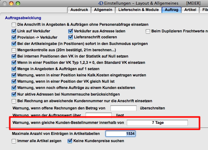 Bei der manuellen Anlage von Aufträgen kann eine Warnung erfolgen, wenn die eingegebene Bestellnummer bereits bei einem Auftrag des Kunden gespeichert wurde.