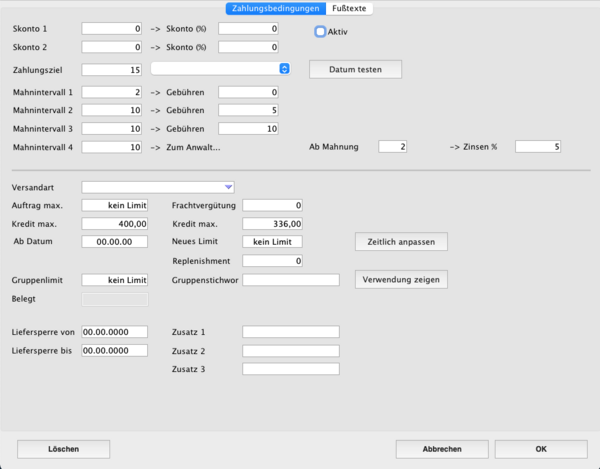 Hinweis: Um diese nutzen zu können, müssen Sie die Checkbox "Aktiv" aktivieren. Wird diese nicht aktiviert, benutzt deLUXE-ERP die Zahlungsbedingungen aus den Einstellungen.