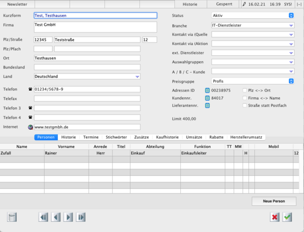 • Einen neuen Ansprechpartner legen Sie per einmaligen Klick auf den Button "Neue Person" an.