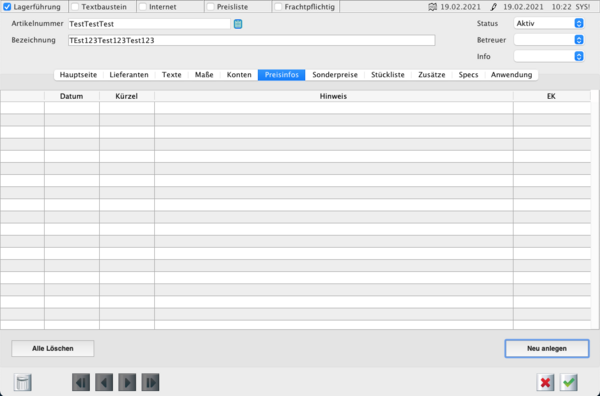 Der Artikelstamm gliedert sich in 8 unterschiedliche Bereich / Reiter auf.