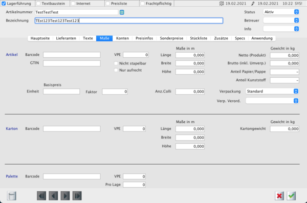 Im Reiter Maßen können Sie z.B. die Maße der Artikel und des Kartons eintragen. Des Weiteren können Sie hier für entsprechende Artikel Barcodes hinterlegen, diese werden bei einem Etikettendruck als Strichcode ausgegeben.