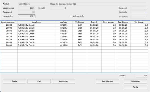 • In der Liste wird Ihnen die für den Auftrag reservierte und die verfügbare Menge angezeigt.