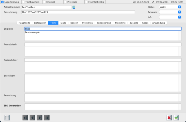 Im Bereich Texte können Sie z.B. Fremdsprachentexte für den Artikel hinterlegen, die dann für den Ausdruck verwendet werden können.