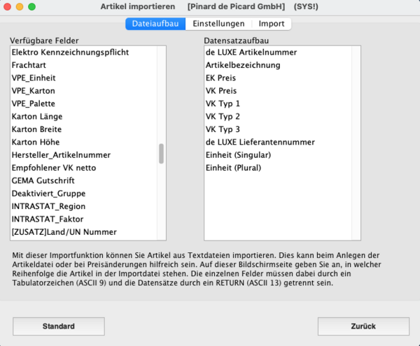 Durch Anklicken eines Feldes aus der Liste übernehmen Sie das Feld in die Aufbaudefinition im rechten Teil des Layouts. Die Definition beschreibt, in welche Felder die importierten Daten gespeichert werden sollen.