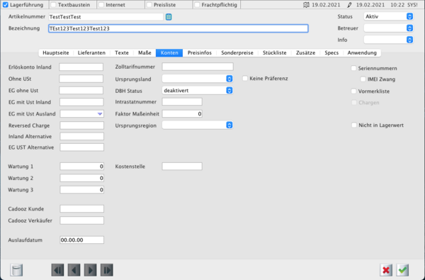 Im Bereich Konten können z.B. abweichende Erlöskonten eingetragen und weitere wichtige Einstellungen für den Artikel vorgenommen werden.