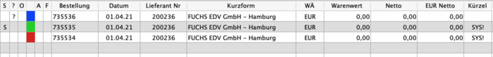 Die Einträge aus der Bestellvorschlagsliste haben automatisch den Status 1, da sie bereits einen Lieferanten in der Liste gewählt haben.