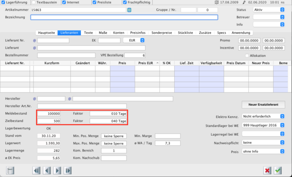 Geben Sie zum Beispiel 90 Tage an und es wurden in diesem Zeitraum 350 Warenausgänge registriert, erhalten Sie einen Tagesschnitt von 3,88 Einheiten. Zu jedem Artikel können Sie hierzu im Reiter „Lieferanten“ (2. Reiter) den Faktor für den Melde- und den Zielbestand angeben. Ein Faktor 7 (Tage) würde den Meldebestand in unserem Beispiel wie folgt berechnen: 3,88 * 7 = 27 (gerundet).