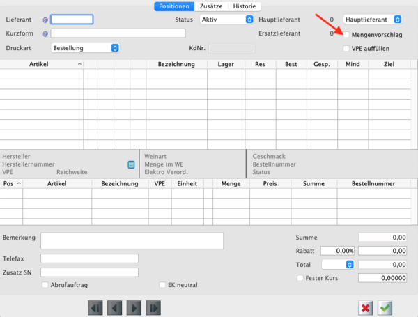 Informationen zur Vorgehensweise bei der manuellen Erfassung einer Bestellung auch unter Verwendung eines Mengenvorschlags und eine Erläuterung der Bestelleingabemaske finden Sie im Bereich Bestellmaske.