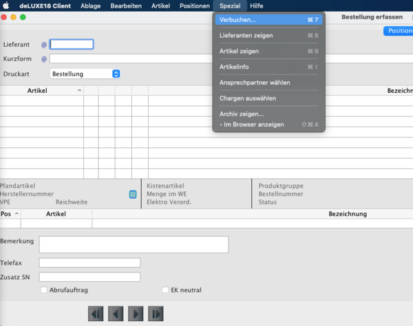 • Wurden alle Angaben in der Bestellung erfasst, kann die Bestellung verbucht werden (Menü "Spezial / Verbuchen"). Erst dann gilt diese Bestellung als bestätigt und steht im Bereich Wareneingänge und in der Bestellrückverfolgung zur Verfügung.