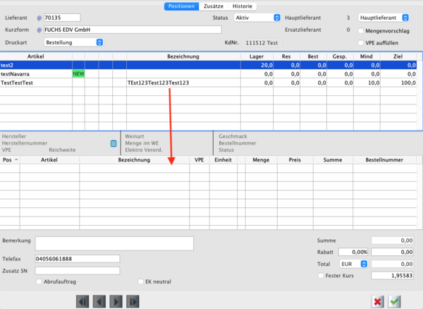 • Um Artikel in die Bestellpositionsliste zu übernehmen, machen Sie einen Doppelklick auf den jeweiligen Artikel. deLUXE-ERP übernimmt diesen Artikel in das untere, „aktive" Bestellfenster mit der Menge „0“. Hier können Sie anschließend die Bestellmengen festlegen oder evtl. Preiskorrekturen vornehmen.