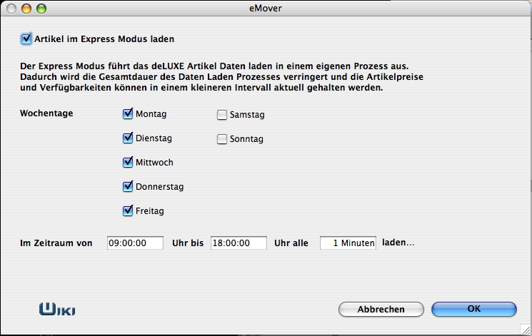 Hier stellen Sie die Wochentage, die von und bis Zeit und das Intervall in Minuten ein. Mit der Schaltfläche Artikel im Express Modus laden aktivieren Sie die Option. Wenn die Option aktiviert wurde, werden die Artikel im Hauptprozess "deLUXE-ERP Daten laden" nicht mehr überprüft.