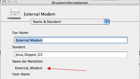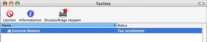 Der Fax Robot Client schreibt die zu faxenden Dokumente als Postskriptdatei (.ps) in das Verzeichnis FAX_AUSGANG welches automatisch im Verzeichnis deLUXE_Objekte angelegt wird. Per Shell Skript wird OSX aufgefordert dieses Dokument zu faxen. Anschließend wird das Dokument in das Verzeichnis FAX_ARCHIV verschoben. OSX verwaltet für den Drucker (in unserem Beispiel External_Modem) eine Liste mit offenen und erledigten Faxen. Sobald der Faxauftrag an OSX übertragen wurde, hat deLUXE-ERP keine Kontrolle mehr über das Fax. Ob ein Fax gesendet wurde oder Probleme aufgetreten sind, können Sie aktuell nur im Fenster des Modems feststellen.