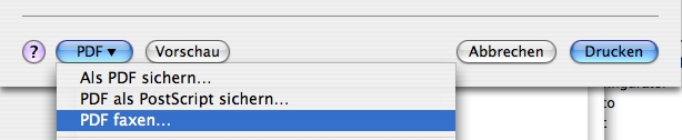 Damit die Einstellungen vorgenommen werden können, muss zunächst aus einem Programm (z.B. TextEdit) ein Testfax gesendet werden. Beim ersten Faxen werden dabei vom Betriebssystem bestimmte Einstellungen vorgenommen. Wählen Sie einfach im Druckerdialog die Option PDF faxen.