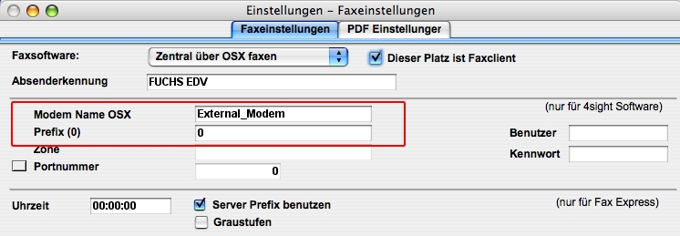 Wenn eine Null als Amtswahl notwendig ist, kann diese als Prefix eingegeben werden. Die anderen Einstellungen von Fax Express haben keine Auswirkungen.