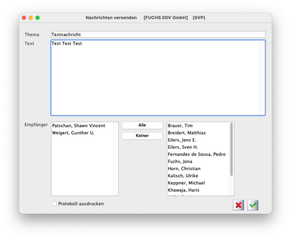 - Mit der Option "Protokoll ausdrucken", können Sie einen Beleg mit der Empfängerliste erstellen lassen.