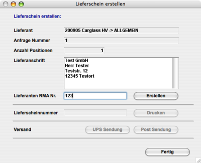 Wählen Sie im deLUXE-ERP Menü „Lieferanten / Lieferschein erstellen“ aus. Hier können Sie auch eine online-Anfrage bezüglich des RMA-Auftrags starten, indem Sie auf "Anfrage erzeugen" gehen.