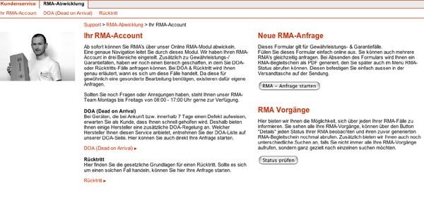 Dort haben sie die Möglichkeit, einen neuen RMA-Auftrag anzulegen oder den Bearbeitungsstand bereits angelegter RMA-Aufträge abzurufen.
