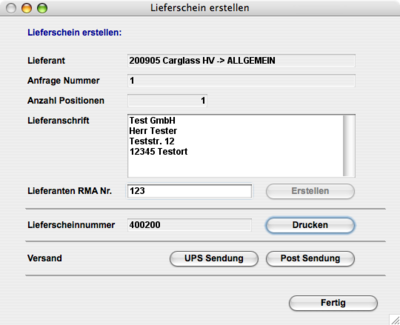 Mit „Fertig“ verlassen Sie das Fenster wieder. Versenden Sie nun den ausgedruckten Lieferschein mit dem Artikel zu Ihrem Lieferanten. Auch in Ihrem RMA-Auftrag ist zu sehen, dass der Artikel zu Ihrem Lieferanten rausgegangen ist. So ist jeder Mitarbeiter mit den entsprechenden Rechten darüber informiert in welchem Status sich der RMA-Auftrag befindet.