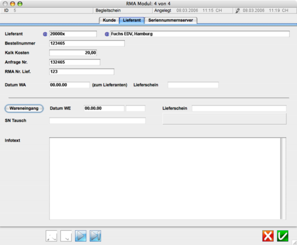 Melden Sie sich jetzt bei Ihrem Lieferanten, lassen Sie sich eine RMA-Nummer geben und schreiben Sie diese in das "Feld RMA Nr. Lief.". Bestätigen Sie Ihre Eingaben mit dem grünen Häkchen, um in die RMA-Übersicht zu kommen.