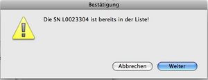 Wird eine Seriennummer importiert die sich bereits in der Liste befindet, erscheint ein Hinweis. Sie können bestimmen, ob der Import weiterlaufen soll, oder ob abgebrochen wird.