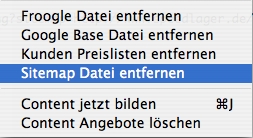 Wenn Sie sofort eine neue Sitemap Datei erstellen und übertragen lassen möchten, können Sie mit der Funktion Sitemap Datei löschen im Menü Spezial die aktuelle Datei löschen. Der eMover beginnt dann anschließend mit der Erstellung einer neuen Datei.