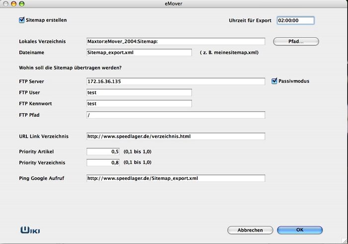 - FTP Server = die IP oder der Name des Webservers für den die Sitemap gedacht ist.