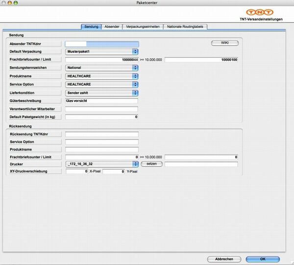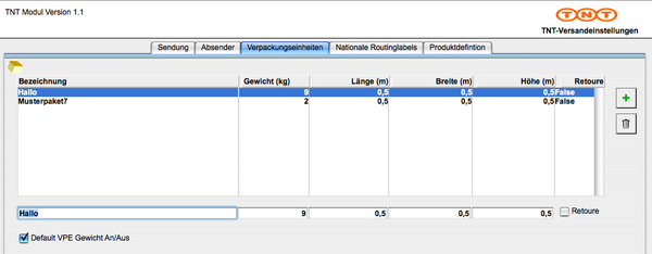 • Default-Verpackung: Kundennummer bei TNT