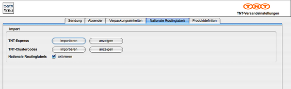 Für den nationalen Versand gibt es ein Nationales-Routing-Label Etikett (Barcode C128) oder das einfache TNT-Versand Etikett (Barcode C39). Je nach Vereinbarung mit TNT wird das entsprechende Etikett verwendet.