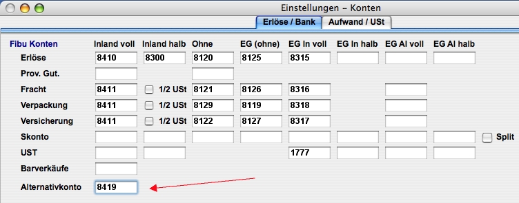 Klären Sie zunächst mit Ihrer Buchhaltung auf welches Konto die Erlöse des alternativen Steuersatzes gebucht werden sollen. Die Kontonummer geben Sie dann in den Einstellungen "Konten" ein.