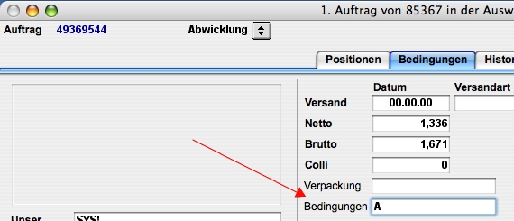 Angesteuert wird das alternative Konto und der Prozentsatz durch die Eingabe eines "A" in den Bedingungen des Auftrages. Bei Rechnungserstellung wird dieser Wert geprüft und dann die entsprechenden Werte in die Rechnung übernommen.