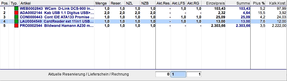 Die Markierung der Position bleibt nun erhalten. Die Liste springt beim Neuanlegen nicht mehr an den Anfang der Positionen. Die Eingabe der Werte "Aktuelle Reservierung", "Aktueller Lieferschein" und "Aktuelle Rechnung" erfolgt für die markierte Position im Fußteil des Layouts.