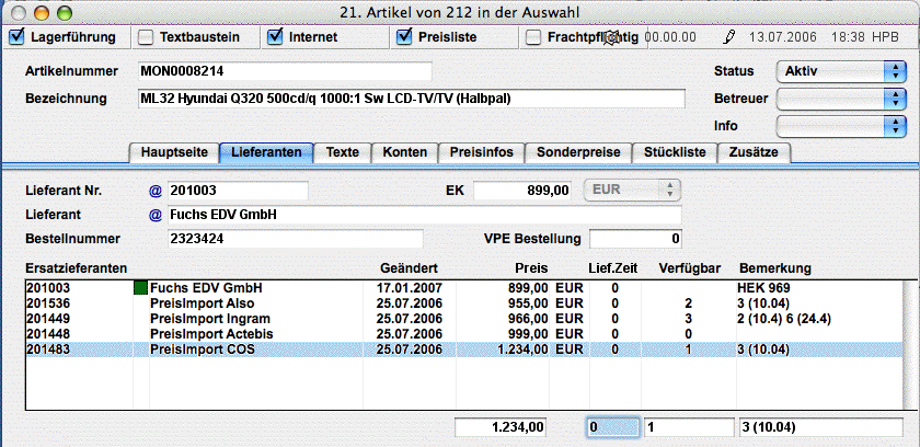 Die Artikelseite mit den Ersatzlieferanten wurde komplett überarbeitet. Die Liste wird nun wie nun in einer neuen Form dargestellt. Ein grüner Kasten markiert den Hauptlieferanten.