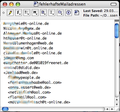 Grundlage für diese Funktion ist eine Textdatei in der die Mailadressen durch ein Returnzeichen (ASCII 13) getrennt untereinander stehen. Dabei werden Leerzeichen und "<" oder ">" ignoriert.