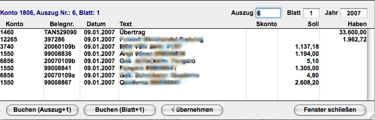 Im Fenster Dialogbuchungen wurde die Anzeige der letzten Buchungen des Kontos vergrößert. Außerdem kann nun durch die Eingabe einer Auszug und Blattnummer auf die Buchungen eines bestimmten Kontoauszuges auch weiter in der Vergangenheit zugegriffen werden.