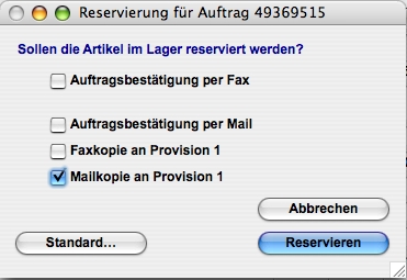 Ist im Feld Provison 1 des Auftrags eine Kundennummer hinterlegt, kann nun beim Reservieren des Auftrags eine Kopie der Bestätigungsmail an den Vertriebsmitarbeiter gesendet werden. Der Dialog bietet eine entsprechende Checkbox an.