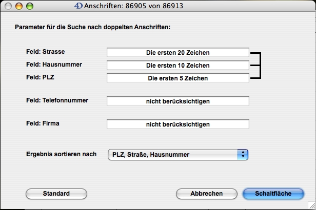 Die Funktion zum Auffinden von doppelten Anschriften wurde überarbetet. Es erscheint nun zunächst ein Dialog in dem die Kriterien für den Abgleich angegeben werden können.