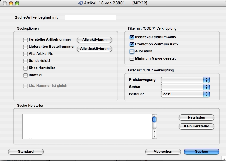 Werden Werte in den PopUp Menüs ausgewählt, müssen alle Kriterien zutreffen, damit ein Artikel als Treffer angezeigt wird. Um ein Kriterium unberücksichtigt zu lassen, stellen Sie das PopUp Menü auf den ersten Eintrag (der Eintrag ist leer).